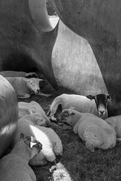 GB. England. Wakefield. 2018. Yorkshire Sculpture Park. Henry Moore: Two Large Forms. Sheep shelter from 27 degree C heat in the shadows.