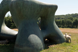GB. England. Wakefield. 2018. Yorkshire Sculpture Park. Henry Moore: Two Large Forms. Sheep shelter from 27 degree C heat in the shadows.