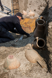 ITALY. Pompeii. February 2019. New excations and discoveries. New excations and discoveries. Amphoras and a cup found in a "Thermopolium" (tavern) on street of the balconies.