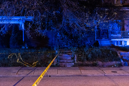 USA. Baltimore, Maryland. 2018. Police tape off the scene of the murder of Jason Reuben Haynes, 41, shot to death on the 4300 block of Park Heights Avenue.