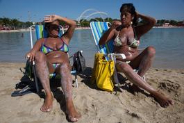BRAZIL. Piscinão de Ramos, Rio de Janeiro. July 6, 2014. Twin sisters, Rosangela (on left) and Rosani bleeching their hair.