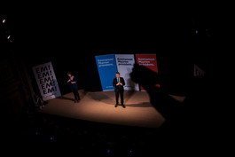 FRANCE, Paris, 2017/03/08. French Presidential candidate, leader of the "En Marche!" ( Forward!, One the Move!) movement and party , Emanuel Macron attends a campaign event for International Women.s Day, "Elles Marchent!", ( "they fem. march") in the Theatre Antoine.