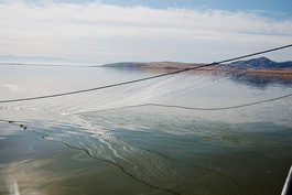USA. Salt Lake City, UT. 2016. For her PHD research, Taylor Hannah along with John Neil and other biologists, takes a boat out from Antelope Island marina to trap two eared grebes and attach satellite devices to their bodies to track their movements during their down months on the great salt lake.