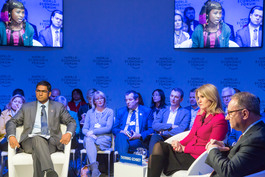 Interactive Session with Pranjal Sharma, Contributing Editor, Businessworld, India; Helle Thorning-Schmidt, CEO, Save the Children International, UK; and Mark Cutifani, Chief Executive, Anglo American, UK. Hindou Oumarou Ibrahim, Coordinator, Association for Indigenous Women and Peoples of Chad (AFPAT), is on the screen. SWITZERLAND. Davos. World Economic Forum Annual Meeting 2017