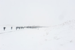 USA. Standing Rock, North Dakota. December 5th, 2016. A group of military veterans and other activists from the Oceti Sakowin Camp (known popularly as Standing Rock) march towards a roadblock set up across the Missouri River, the proposed crossing point for the Dakota Access Pipeline. Tribal youth on horse back stopped the protest before it crossed the bridge. It was established by activists (known as Water Protectors) intent on disrupting the passage of the pipeline in order to protect the local water supply and sacred burial grounds, as well as ensure that treaties made between the Federal government and Standing Rock Sioux are honored.