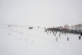 USA. Standing Rock, North Dakota. December 5th, 2016. A group of military veterans and other activists from the Oceti Sakowin Camp (known popularly as Standing Rock) march towards a roadblock set up across the Missouri River, the proposed crossing point for the Dakota Access Pipeline. Tribal youth on horse back stopped the protest before it crossed the bridge. It was established by activists (known as Water Protectors) intent on disrupting the passage of the pipeline in order to protect the local water supply and sacred burial grounds, as well as ensure that treaties made between the Federal government and Standing Rock Sioux are honored.