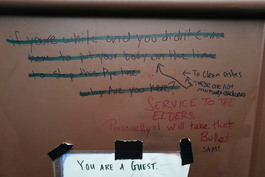 USA. Standing Rock, North Dakota. December 5th, 2016. Bathroom graffiti in the Oceti Sakowin Camp (known popularly as Standing Rock) set up across the Missouri River, the proposed crossing point for the Dakota Access Pipeline. It was established by activists (known as Water Protectors) intent on disrupting the passage of the pipeline in order to protect the local water supply and sacred burial grounds, as well as ensure that treaties made between the Federal government and Standing Rock Sioux are honored.