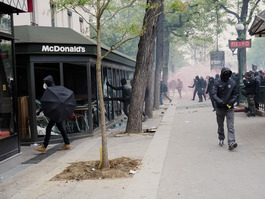 FRANCE. Paris. 1 May 2018. May Day demonstration. Thousands of demonstrators marched across Paris during May Day, joined by protesters from far-left anarchist group Black Blocs. Smashed McDonalds restaurant near Austerlitz.