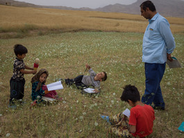 IRAN. Khadjeh Abad Village, Khuzestan. 2018. Mr. Jahanbakhsh, 40 years old, a school teacher forming his class in an open area in Khajeh Abad Village, Khuzestan Province.