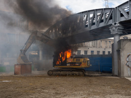 FRANCE. Paris. 1 May 2018. Labour union's May Day rally. Thousands of demonstrators marched across Paris during May Day, joined by protesters from far-left anarchist group Black Blocs. Excavator set on fire.