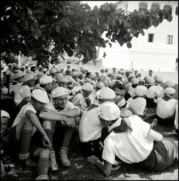 ROMANIA. Bucharest. 1938. A large group of Straja Tarii boys waiting in the shade for the funeral procession for Princess Mary of Edinburgh - Queen Marie of Romania. Straja Tarii was a youth organization in the Kingdom of Romania created in 1935 by King Carol II to counter the growing influence the Iron Guard had over the youth of Romania. M-RM-STR-026