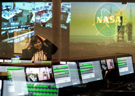 USA. Florida. 2017. Alicia (Aly) Mendoza-Hill, Launch Services Program (LSP) Mission Manager, photographed in Hangar AE, Mission Director’s Center at Kennedy Space Center.