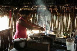COLOMBIA. Morroa Municipality. Cambimba Village. July 2017. Farm and family of Porfirio Nicanor Palancia, 60. Kelly Marina Bergara Gonzales, 23, wife of Nicanor's son, cooking scrambled eggs from their farm's chickens.