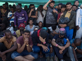 ITALY. Catania. July 14, 2017. Men and women wait to disembark a ship taking several immigrants to the port of Catania, on the island of Sicily, after a rescue operation in the Mediterranean Sea. About 1,460 refugees and immigrants were saved by the Italian Coast Guard.