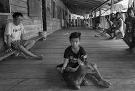 Malaysia. Sarawak. 2018. Indigenous land rights. Mutu Tugang (78), a Penan, on left and a young boy with an injured deer in the foreground Long Jaik longhouse near the Muran Dam. It's a Penan longhouse where Mutu is in a legal dispute for land rights with Shin Yang.