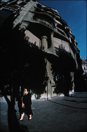 Spain. Catalonia. Barcelona. A woman walks past the Mila House built by Catalan architect Antoni Gaudi ((1852-1926). Casa Milá, popularly known as La Pedrera or "open quarry", a reference to its unconventional rough-hewn appearance, is a modernist building. It was the last private residence designed by Gaudí and was built between 1906 and 1912. It was declared a World Heritage Site by UNESCO in 1984. 1978