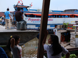 PERU. Iquitos, Lima. September 2017. Passengers await a ferry at the Puerto Productores along the Itaya River.
