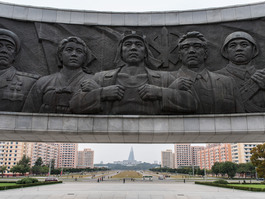 Bronze work depicting workers, farmers, and intellectuals, flanked by the soldiers; Monument to Party Foundation, Pyongyang. The symbol of the Korean Workers’ Party adds a writing brush, for the intelligentsia, to the traditional hammer and sickle of other communist parties.
