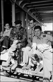 EGYPT. 1956. On the ferry from Port Said to Port Fuad (left to right): Benjamin Bradlee, European correspondant for Newsweek; Paris-Match photographer Jean Roy; Frank White, Paris Bureau Chief for Time-Life; Paul Bonnecarrere, Jour de France combat photographer.