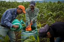MEXICO. San Lorenzo. 2017. Farmers watering a maize field intercropped...