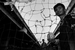 THAILAND. Bangkok. February 10, 2018. Street Sepak Takraw players during a game on a court under an overpass in central Bangkok.