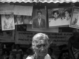 SRI LANKA. Vavuniya. January, 2018. Tamil women gather inside a protest tent in Vavuniya, northern Sri Lanka. Dozens of Tamil women from the area are staging an indefinite protest demanding answers from the Sri Lankan government about the fate of their loved ones, missing since the end of the civil war in 2009.