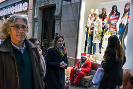 France. Paris. Boulevard Saint Michel. Christmastime. Santa Claus panhandling. 2017