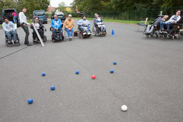 France. Orléans. PEPs. Maison d'Accueil Spécialisée Les Saulniers (Residence for the severely handicapped). Playing a game of boccia, similar to pétanque. Handicapped people incapable of throwing the ball have to use a long tube cut in half to propel it. 2017