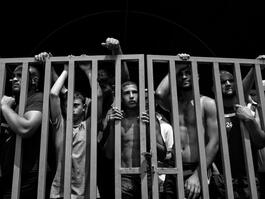 TURKEY. Edirne, 2019. Young men watch the competition behind the door of Kirkpinar's arena during the famous Turkish oil-wrestling tournament.