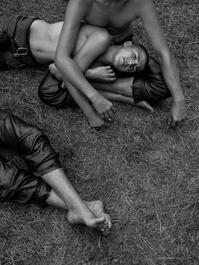 TURKEY. Edirne, 2019. Young wrestlers rest on the grass before the competition starts at the famous Kirkpinar's Turkish oil-wrestling tournament.