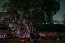 Mexico, near Ixmiquilpan, 2019/4. “Migrant Experience” reenacting of a night march of "Mexican illegal migrants to the US", organized by Eco Parc Alberto holiday resort for a group of about 100 Mexican high school students. "Hiding from border patrol".
