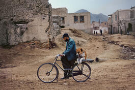 AFGHANISTAN. Kabul. April. 2003. A man riding a bike with a fighting dog on the back.