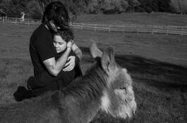 USA. Petaluma, California. March 20, 2020. Our eldest daughter Ruby came to visit with her boyfriend Spencer this past week and we hung out together at a safe distance in one of the fields on our land. This is the two of them with one of our donkeys, L'il Ruby.This is Rubys first true love.