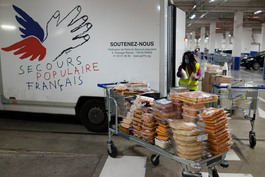 FRANCE. Paris, 02 april 2020. Coronavirus crisis. Some volonteers from the NGO Secours Populaire in the 18th district are collecting food over the expiry date to distribute it to poor poeple. here at "Metro" which provides goods for professionals.