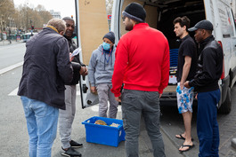 FRANCE. Paris, 02 april 2020. Coronavirus crisis. Some volonteers of NGO Secours Populaire in the 18th district are distributing food to poor poeple around and in the North suburbs. Here at Porte de la Chapelle, four single men are living and confined together.