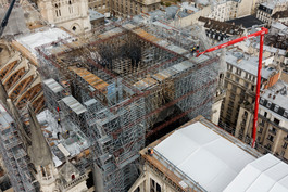 FRANCE. Paris, 11 march 2020 Notre-Dame of Paris reconstruction process still under securisation. View from the top of the crane 80m high. A lift is carrying the operators to 50m and then there are the last 30m to climb on a scaffolding scale.