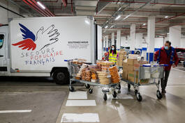 FRANCE. Paris, 02 april 2020. Coronavirus crisis. Some volonteers from the NGO Secours Populaire in the 18th district are collecting food over the expiry date to distribute it to poor poeple. here at "Metro" which provides goods for professionals.