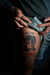A tattoo depicting the face of Michael Stone, an ex-member of the Loyalist UDA paramilitary group in Northern Ireland, convicted of three counts of murder committed in Belfast at an IRA funeral in 1988.