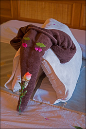 Egypt. Red Sea Governorate. Marsa Alam. 2020. An elephant fashioned by the room steward out of towels, pillows and petals from the garden at the holiday hotel.