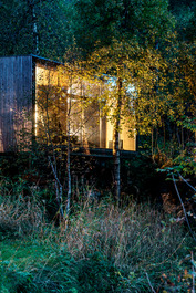 Juvet Landscape Hotel in Valldal. The hotel consists of series of freestanding wood and glass structures, each set with a close view of the woods and river gorge. The hotel is designed by Jensen & Skodvin architects.