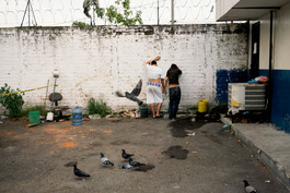 EL SALVADOR. San Salvador. September 9, 2016. Alleged gang members arrested during a raid wait to be processed outside a police station in San Salvador.