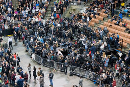 USA. Manchester, NH. February 8, 2016. Media pen during a Donald Trump rally at Verizon Center on the eve of the primary. Donald Trump ultimately won the Republican primary and Bernie Sanders won the Democratic.