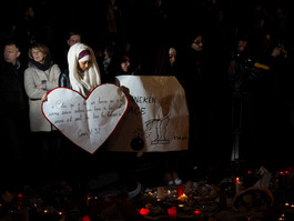 People gather in front of the Bourse of Brussels.