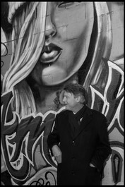 FRANCE. Paris. Jan. 9, 2017. Vincent PEILLON, candidate to the Primaries of the Left for the Presidential elections, visits an art center in the Montreuil popular neighbourhood. He stands in front of a graffiti mural.