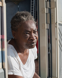USA. Vallejo, California. 2016. Debra in her camper, in a parking lot on Sonoma Blvd and Redwood.