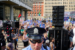 USA. Philadelphia. 2016. People in City Hall Square cheer Jill Stein as she addresses the crowd about the inequities of America's history and the corruption of the political system.