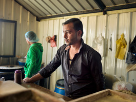 JORDAN. 2016. A portrait of a baker at his bakery in Azraq Camp....