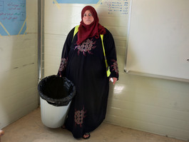 JORDAN. 2016. Elham Ahmed Shawamra, 45 years from DaraÍa, Syria works as a cleaner in the a school in the Za'atari camp. Several members of the school staff, including Mrs. Shawamra, are paid under the UNOPS 'Cash for Work' program.