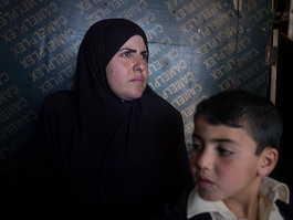 JORDAN. 2016. Thaer Mohamed Hoshan, 45 and his wife Rana Ibrahim Al Sees, 34, both from Daraa. They arrived with their 4 children over three years ago. The kids Mohammed Barra, 16, Omayma (teenage girl), 14, Rebal, 12, Mohammed Iqbal, 10, Hudaifa, 8. When the arrived at Za'atari they just brought some of their possessions; their family photos and their identity papers.