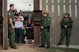 USA. San Diego, CA. 2016. Border patrol agents guard the US side of the border and open the gate to let 6 families unite and hug for three minutes each before closing the gate again. luis hernandez 26 was the first to go.. For a story for GEO about the Hernandez family, one of several families chosen to participate in this cross border celebration of Children’s Day in Mexico. The father of Arturo and Luis, who I photographed in LA, was deported to Mexico and permanently separated from his sons. The emergency door of the border fence opened to give five families separated by the border three minutes each to embrace. The event is organized by Border Angels, a migrant-advocacy group.